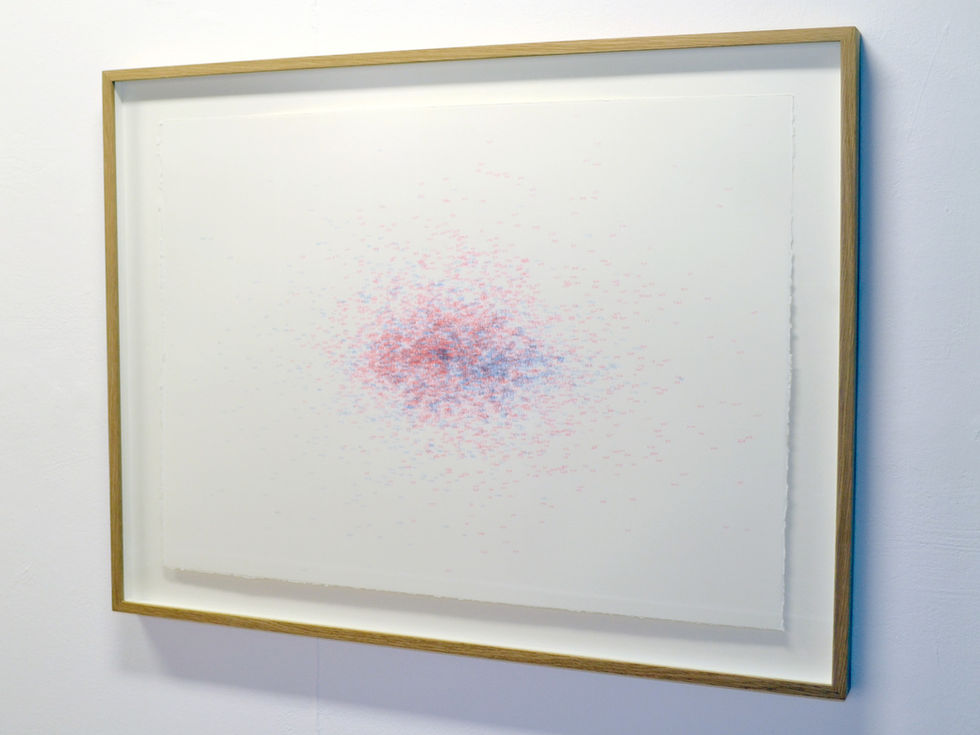 For throws from his right hand he noted the number down in blue pencil, and for throws from his left hand he noted the roll number in red. The overall effect of this polarized mark making was a little dizzying; the overlaid coloured numbers invoked a feeling akin to that of looking at a 3D film still without wearing the glasses. I wondered whether this process was building up an abstract visualization of the operations of the right and left sides of the brain, of the neural processes involved in coordinating the artists’ observations and movements. Or perhaps he had created an algorithm, which, over enough throws, could generate a series of random numbers (i.e. the numbers of the throws which actually landed on the centre cross)? Perhaps if we, as viewers, were able to take a long perspective of the work, it might actually present us with a pattern? What would happen if this process were repeated an infinite number of times? Perhaps, at some point, the die would begin to land on the same spots (thus making the current drawing a blue print or microcosm for further or microcosmic activity)? He described these pieces as being an “idiosyncratic trace” of the act of making and “an accumulation of all the imperfections of person and die” as he alternated between left and right, endeavouring to balance the drawing.