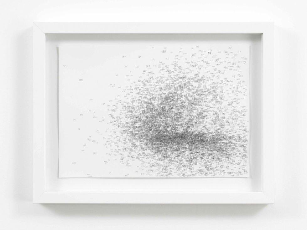 In his Gateshead studio – with the soporific hum of an industrial heater reverberating round the space – Nick Kennedy begins the studio visit by showing me a new Dice Drawing he was working on. He explained that it was part of an ongoing series that he’s been engaged with for the last two to three years which follows a general, predefined mode of production. He illustrated this process by demonstrating the repeated action involved in the drawing’s generation; he sits centrally in front of a piece of paper and rolls a die at a cross marked at the centre of the paper with the aim of landing it on this cross. With each successive roll he clicked a counter and then noted the number displayed on the counter (which corresponded to the roll number) down at the point where the die landed on the paper. By rolling the die many times the drawing evolves from what looks initially like quite a loose, scatological drawing (when the rolls number around one hundred) to a denser, more nebulous accumulation of handwritten numbers (as the rolls reach the thousands). He compared this process and systematic way of working at a desk, to being “…very business-like” and this continuous, mechanical mode of production seemed to me faintly reminiscent of a mathematical research experiment or of data collation; the parameters of the research experiment being set, this process was simply the “following through” of those instructions.